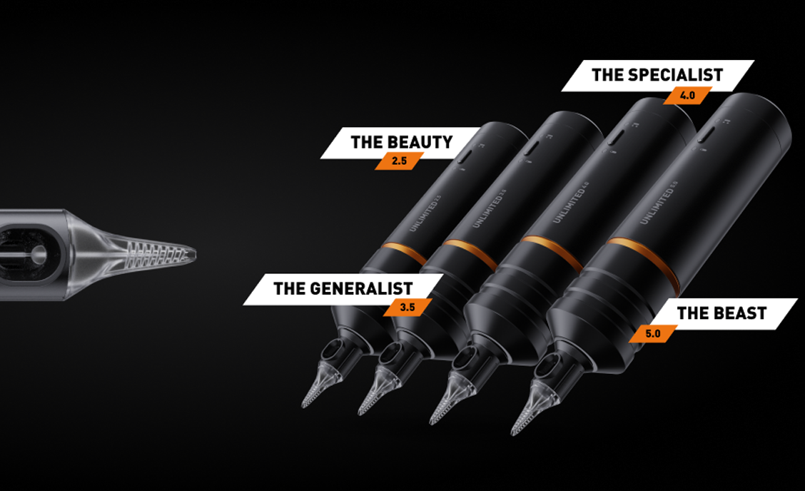 Je nach Leistungsbedarf und Anforderungen ist eine der vier Versionen dieser kabellosen Tattoo-Maschine am besten geeignet: